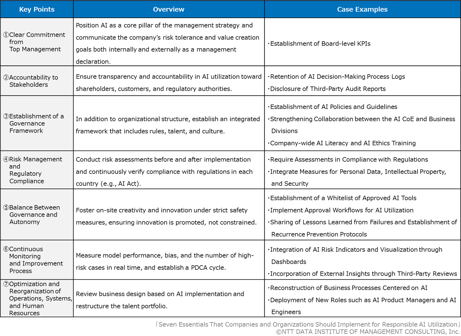 As AI becomes central to corporate competitiveness, responsible utilization grounded in ethics will determine which companies win trust from markets, regulators, and society. The following seven essentials (see Figure 4) provide a foundation for building that trust and ensuring sustainable growth.