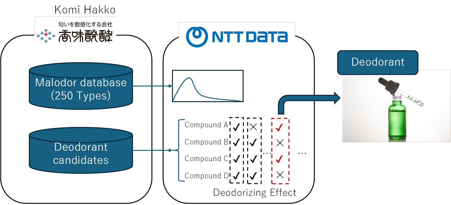 To overcome this, NTT DATA combined its proprietary optimization technology, cultivated within its laboratory, with Komi Hakko's scent quantification technology. This collaboration has enabled the efficient exploration of scent composition patterns that would be difficult for humans to discover manually, and led to the development of a new formulation process for deodorant products that reduces production time by approximately 95% compared to conventional methods - achieving a remarkable improvement in the efficiency of material development processes.