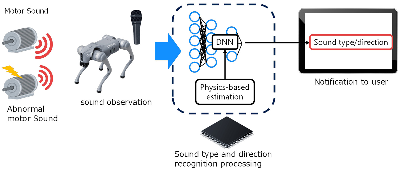 Using this technology, we trained and performed inference on two types of sounds: normal and abnormal motor sounds. In accuracy verification, the average error in estimated sound azimuth angle was 17.2 degrees, the F-value for sound type estimation was 83.5%, and the recall value was 90.3%. Compared to verification (1), the number of target sounds increased and distinguishing between sounds was more difficult, resulting in a lower F-value, but sufficient accuracy was obtained.