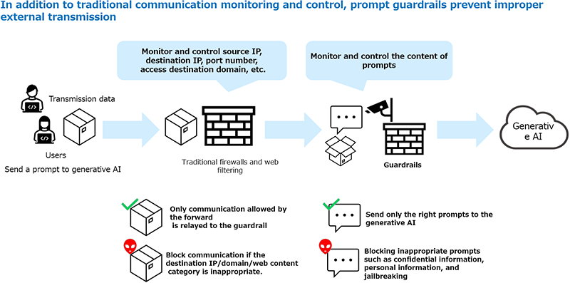 Securing the communication channel alone is no longer sufficient. Organizations now require a new mechanism that protects the actual content of what is being input into and generated by generative AI. This mechanism is known as the guardrail. Guardrails monitor and control generative AI prompts and outputs in real time, helping prevent information leakage and other forms of improper use.