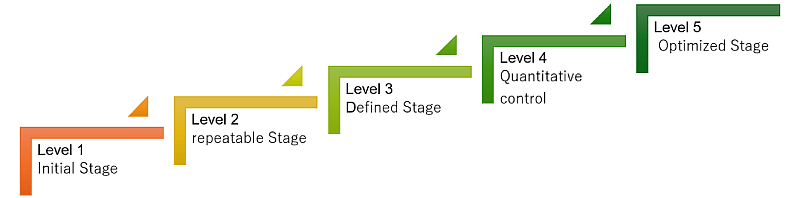 A commonly referenced example of a maturity model is CMMI (*1), which categorizes organizational maturity into the following levels: