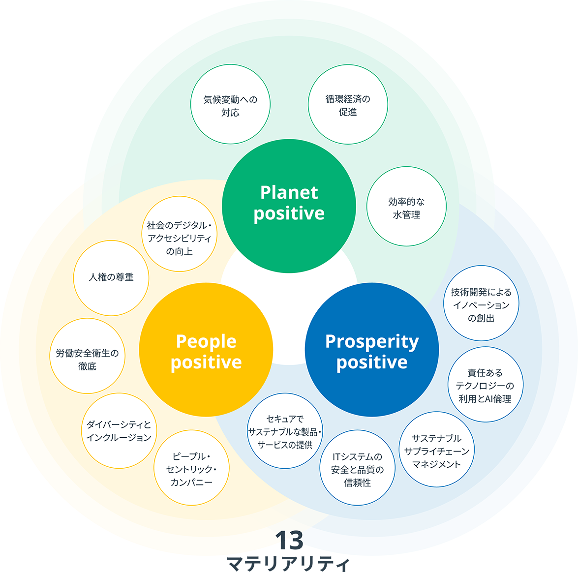 近年、当社グループはデータセンタビジネスの拡大や生成AIの進展といった変化を受け、環境・社会との関係性がより深まっています。これを受け、2025年度より、グローバルで共通の指針として、「Planet Positive」「Prosperity Positive」「People Positive」の3つの価値観を掲げました。「3 Positives」には、ネガティブな影響を抑え、ポジティブな影響を広げることで、環境・経済・社会に良いインパクトを与え、持続的成長を実現したいという私たちの想いが込められています。私たちは「3 Positives」を意識することで、業務への取り組み方が自然と変わり、行動変容を生み出し、新たなビジネスの可能性が広がっていくと確信しています。