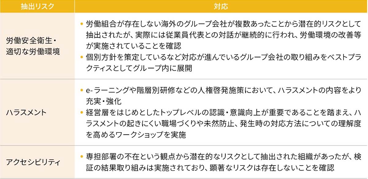 2024年度は、前年度に抽出された「労働安全衛生・適切な労働環境」「ハラスメント」「アクセシビリティ」の各リスク防止・軽減の取り組みを進めました。