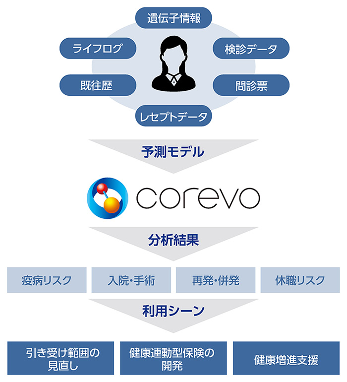 健康寿命の延伸を目指し、特に生活習慣病の発症予防に向けた個人の生活習慣の改善や健康リスクの把握が求められています。そこでNTTデータとNTTは、健康診断データからAIが生活習慣病の発症リスクを予測し、保険業界で活用するための評価プロジェクトを進めています。例えば、健康診断を継続して受診していない場合のデータの抜け漏れや、期間限定のデータ、数少ない疾病の発症を扱う場合の少量のサンプルデータなどにおいて、高精度なデータ分析を実現するには課題がありましたが、NTTのAI関連技術「corevo®」のひとつとして、不均質で希少なデータであっても高精度な分析ができる手法を確立し、将来の生活習慣病の発症確率の予測を実現しました。この予測技術は、糖尿病では9割の正解率で発症を見分けています。NTTデータでは、引き続き高齢者版の予測モデルの確立やデータ分析の個別受託などを視野に2020年から予測技術を商用サービスとして提供を予定しています。