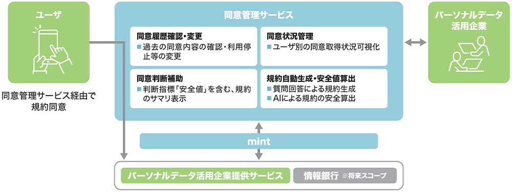 NTTデータでは、情報銀行の仕組みを支えるプラットフォームとして「My Information Tracer™」(以下、mint)を提供し、パーソナルデータの流通を担っています。さらに、個人によるパーソナルデータのコントロールを可能とする同意管理サービスの実用化もめざしています。また、金融、通信、流通、インフラといった様々な業界の企業が参画するコンソーシアムを設立し、パーソナルデータを活用した新たなサービスの検討を支援しています。今後も、情報銀行の進化を促すことで、社会に新たな価値を創出していきます。