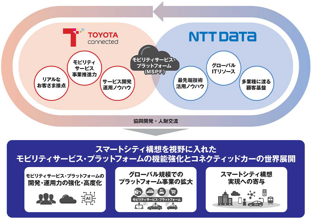 トヨタコネクティッド社との業務提携で、同社のコネクティッドカー向けサービス事業のノウハウとNTTデータのグローバルでのITリソースの融合を図ることで、CASEやMaaSで大変革の最中にある自動車業界において、豊かで心ときめくモビリティサービス事業の創出に貢献します。