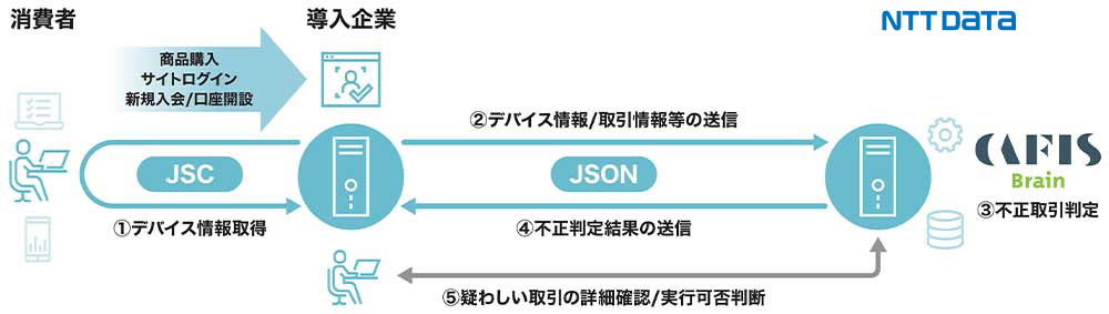 こうした状況を踏まえ、NTTデータでは、エンドユーザが操作する端末(パソコン、スマートフォン等)の情報を抽出し、取引情報と合わせ属性・行動分析を実施することで、不正取引を高い精度で検知するクラウドサービス「CAFIS Brain®」を提供しています。