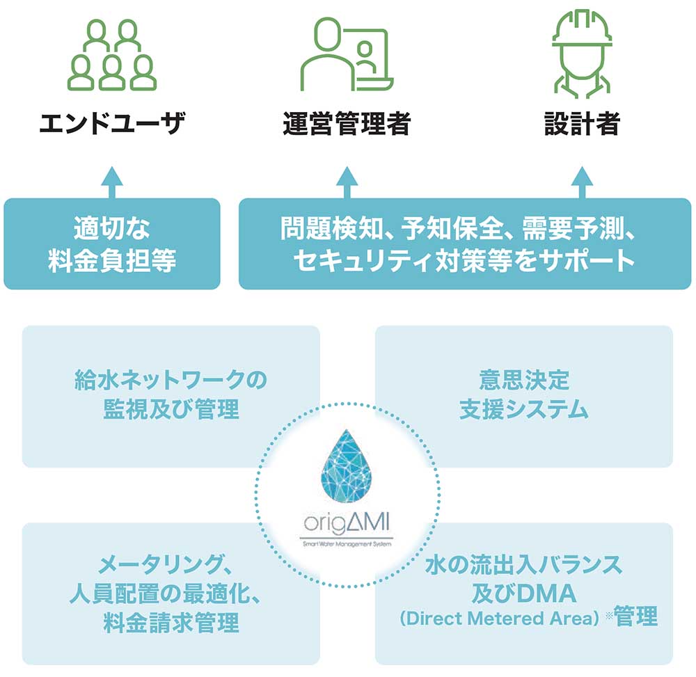 配水システムのモデリング、監視、制御を実現したスマートウォーターマネジメントシステム「origAMI」を開発し、NTTデータのIoT技術と融合することで、限りある水資源を適切に管理し、安全な水の確保と供給を持続的に実現しています。
