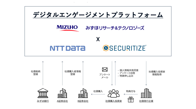 株式会社NTTデータ(本社:東京都江東区、代表取締役社長:本間 洋、以下:NTTデータ)は、みずほリサーチ&テクノロジーズ株式会社(以下、MHRT)およびSecuritize Japan株式会社(以下、Securitize)との協業により、みずほ銀行向けにデジタルエンゲージメントプラットフォーム(以下、「本プラットフォーム」)を構築したことをお知らせします。みずほ銀行は本プラットフォームを活用して、発行体向けにデジタル特典付き社債の取扱いを開始しました。