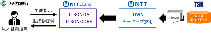 東京商工リサーチが提供する「TSR REPORT(国内企業調査レポート)」およびインターネット上のIR情報等の公知情報を情報源とし、NTTデータが提供する生成AIサービス「LITRON」、NTTのIOWNデータハブ技術を活用し、企業情報分析業務(顧客概要・財務分析・競合比較等を含む企業分析)にて導出される経営課題起点の営業トピック資料を作成し、営業担当者の視点からその有用性を検証します。加えて、多様なデータ形式で大量の情報をセキュアに管理・分析するために、分散する複数のデータソースを仮想的に一元管理するNTTのIOWNデータハブ基盤の構成要素である仮想データレイク注3を活用します。生成された経営課題起点の営業トピック資料は、実際に営業店で業務に携わるりそな銀行の従業員が評価し、そのフィードバックをもとにチューニングを複数回実施することで、精度と実用性の向上を図ります。