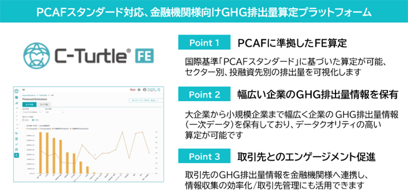 C-Turtle FEは、C-Turtle上で、金融機関の国際的基準「PCAF注2スタンダード」に準拠した、ファイナンスド・エミッション注3の可視化と削減を支援するプラットフォームです。投融資先の一次データを活用し、投融資に係るGHG排出量およびその削減努力を反映したデータクオリティーの高いファイナンスド・エミッション算定が可能となります。これにより、阿波銀行は、投融資ポートフォリオ全体における脱炭素支援を、経験と勘に頼らないデータに基づいた戦略的アプローチとして進めることが可能になります。