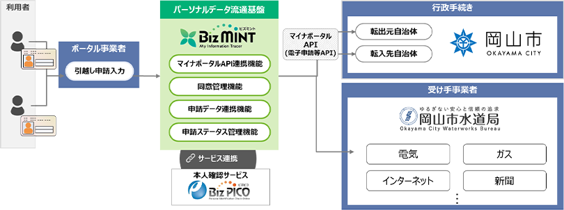 https://myna.go.jp/html/index.html - 注4 図は、NTTデータが提供する「BizMINT引越」における情報連携の概念図です。岡山市での具体的な導入内容は調整中です。