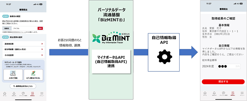 所得情報は、NTTデータのパーソナルデータ流通基盤「BizMINT」を通じて取得します。マイナポータルAPI注2の一つである自己情報取得APIと連携し、利用者の同意のもと必要な情報をアプリへ提供します。自己情報取得の際にはマイナンバーカードの券面事項入力補助APを用いて本人の基本4情報(氏名、住所、生年月日、性別)も取得します。