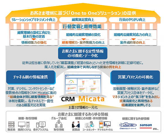 図:西日本シティ銀行の新営業支援システム「CRM Micata」に統合される情報と導入後の効果