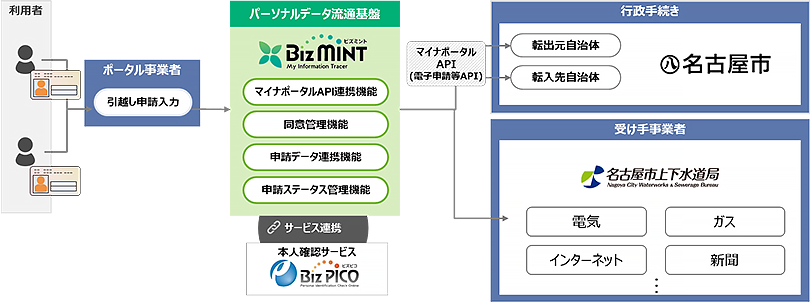 名古屋市は、「名古屋市役所DX推進方針」において、市民一人一人により適した市民サービスの推進に取り組み、市民をはじめとする利用者にとって快適で価値あるデジタルトランスフォーメーション(DX)を進めています。現在、引越し手続きにおいては、自治体である名古屋市や電気・ガスなどの民間事業者に対して、それぞれに新住所等を届け出る必要があり、市民の手続き負担や引越し繁忙期の窓口混雑が課題となっています。一方、NTTデータは、パーソナルデータ流通プラットフォーム「BizMINT」注2と、マイナンバーカードによる本人確認・電子署名機能「BizPICO®」注3を活用し、引越しポータルサイトで入力された情報を、電気・ガス等の事業者、ならびにマイナポータル注4を通じて自治体に同時に連携することで、引越し手続きのワンストップ化を実現する「BizMINT引越」を提供しています。また、NTTデータ東海は東海エリアにおいて、NTTデータグループとの連携のもと、先進性・創造性に富んだ各種システムの開発に取り組み、これらを通じて地域の人々の豊かな暮らしの向上に寄与してきました。