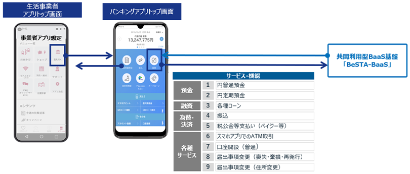 地域金融機関ではデジタル接点の拡張と新たな取引機会の創出が求められる一方、流通・交通・通信などの生活サービス事業者においては、自社サービスへ金融機能を組み込むための制度対応やシステム構築の負担が課題となっています。本取り組みでは、BeSTA-BaaSを基盤として銀行機能を生活サービスの利用体験の中に組み込み、口座開設や残高確認、振込・支払い、スマホアプリによるATM入出金などをワンストップで提供する仕組みを実現します。