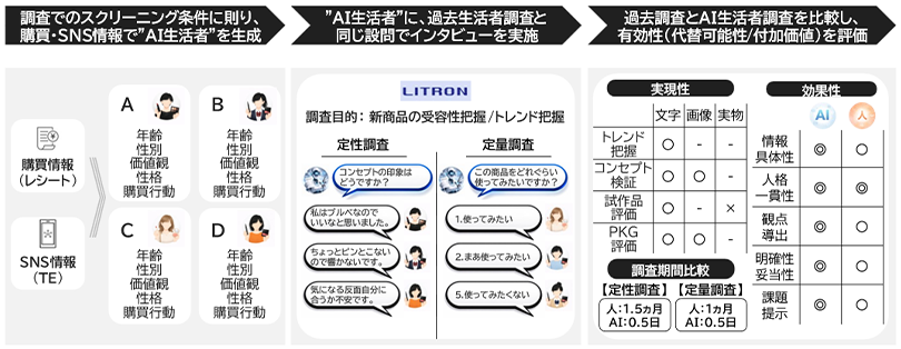 そこで、花王がこれまで蓄積してきた生活者調査データに加え、購買データやSNSデータ注1をもとに、NTTデータのAIエージェントサービス「LITRON® Marketing注2」を活用することで、商品開発の調査インタビュイーとなる複数のAI生活者とAIインタビュアーを作成。AI同士によるインタビュー調査を実施し、調査における対象者呼集・日程調整・実調査の時間を1.5カ月から0.5日(99%削減)に短縮できることを確認しました。