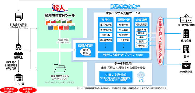 提供開始にあたっては、税理士事務所約13,000所が利用する「達人®シリーズ」の導入事務所などを含む既存顧客基盤を活用し、全国の税理士事務所への展開を進めます。今後、AIを活用した機能のさらなる高度化や金融機関や公的機関などとの連携も視野に入れ、税理士をハブとした中小企業支援のエコシステムの構築をめざします。