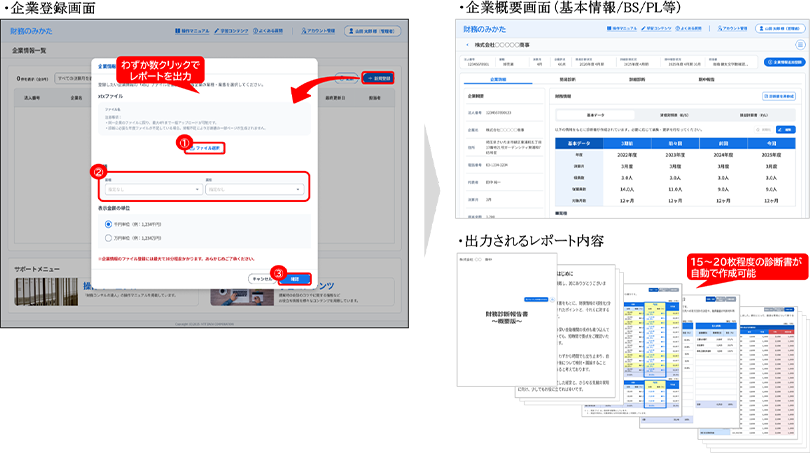 図2:本サービスの画面および自動出力レポートイメージ