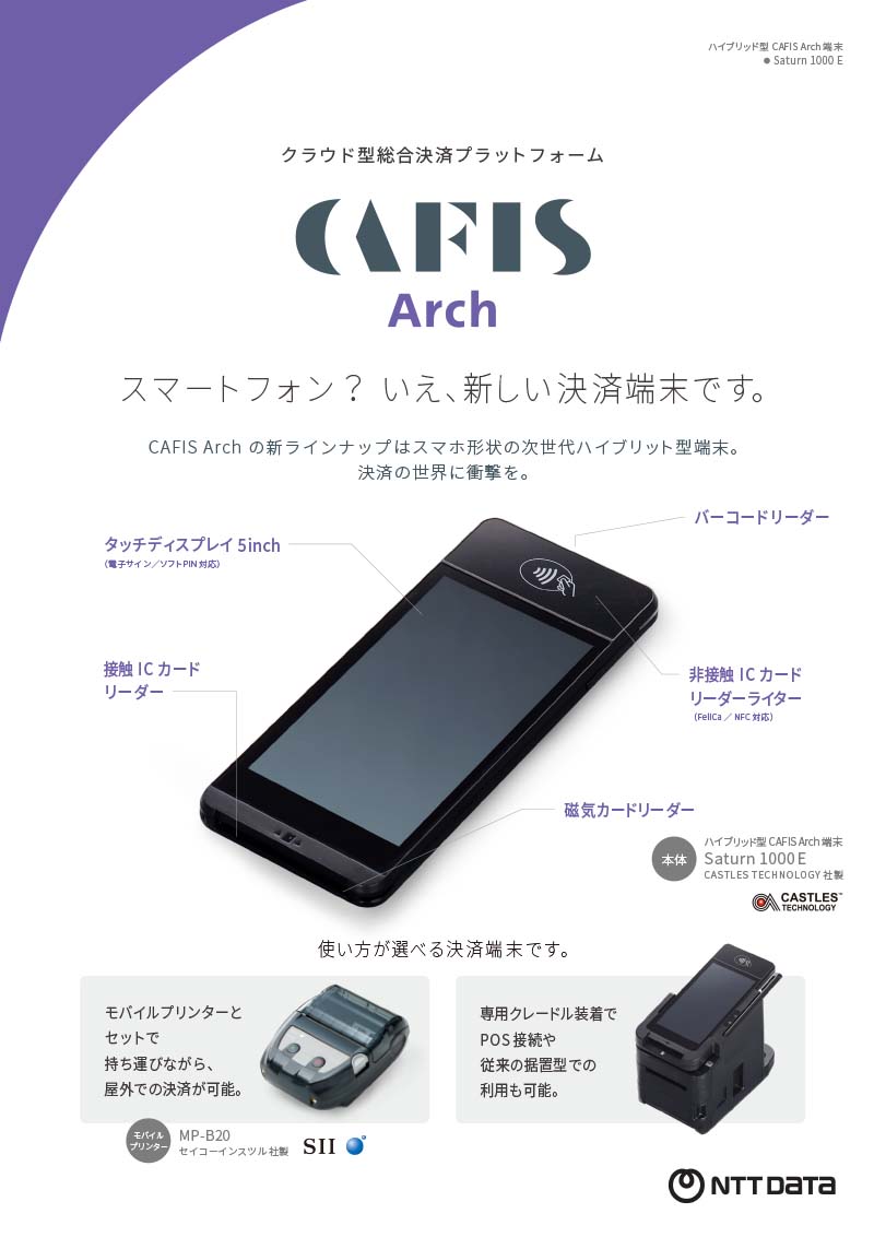 決済の世界に衝撃を。スマホ形状の次世代ハイブリット型端末、CAFIS Arch Saturn 1000 Eのご紹介リーフレットです。