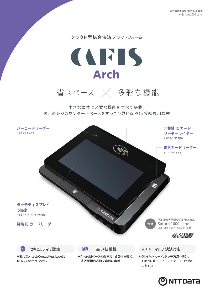 インバウンド、地方創生のツールとして、最新の決済はもちろん、様々な周辺サービスが利用できるCAFISの新しい決済端末「CAFIS Arch」ご紹介リーフレットです。