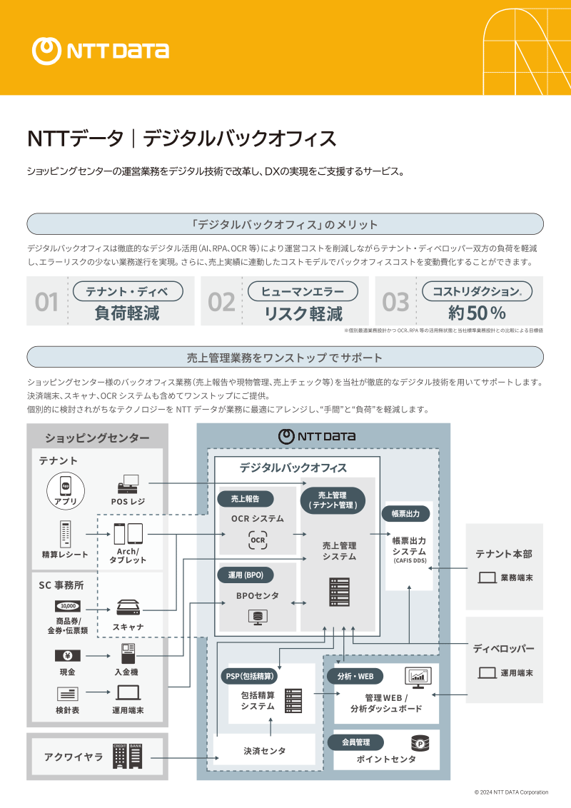 ショッピングセンターの運営業務をデジタル技術で改革し、DXの実現をご支援するサービス、デジタルバックオフィスのご紹介リーフレットです。