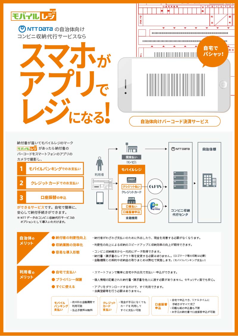 自治体向けバーコード収納サービス「モバイルレジ」のご紹介リーフレットです。