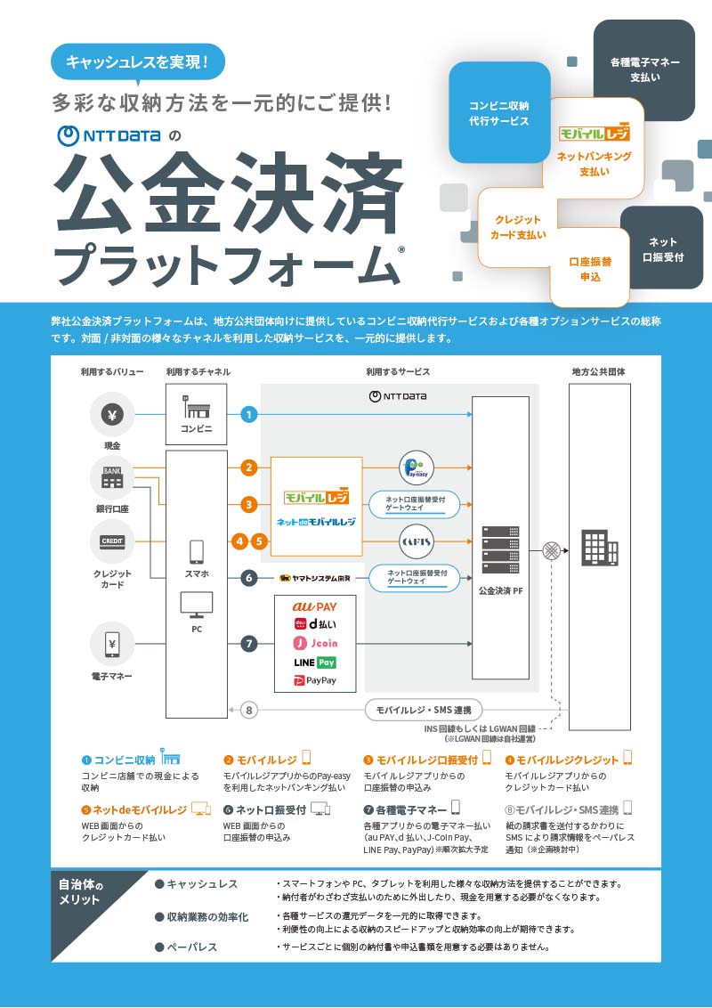 自治体向けコンビニ収納代行サービスおよび各種オプションサービスをご提供する公金決済プラットフォームのご紹介リーフレットです。