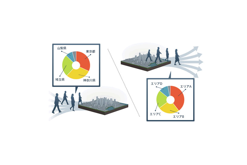 居住地域別の人口分布を把握することができます。あるエリアにいる人がどこに住んでいるか、また、ある地域に住む人が、どこに移動しているかを推計できます。
