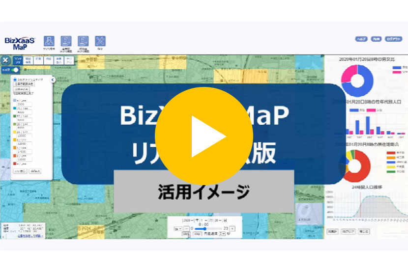 動画で実際の操作画面をご紹介します。地図上で選択した任意のエリアや500mメッシュ単位の時間別人口を視覚的に把握でき、直近1時間前のデータから、1か月前や1年前といった過去に遡ったデータ、またはそれらデータの推移も見ることができます。