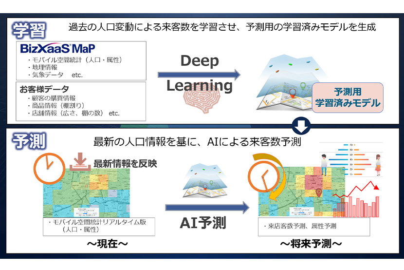 モバイル空間統計にBizXaaS MaPの技術・コンテンツを掛け合わせることで、建物や道路単位といったピンポイントエリアにおける人口推計や、数時間先の人口予測を実現します。ビジネス環境の変化に適応するための、より高精度の需要・来客予測や、他社と差別化した独自戦略の検討が可能です。