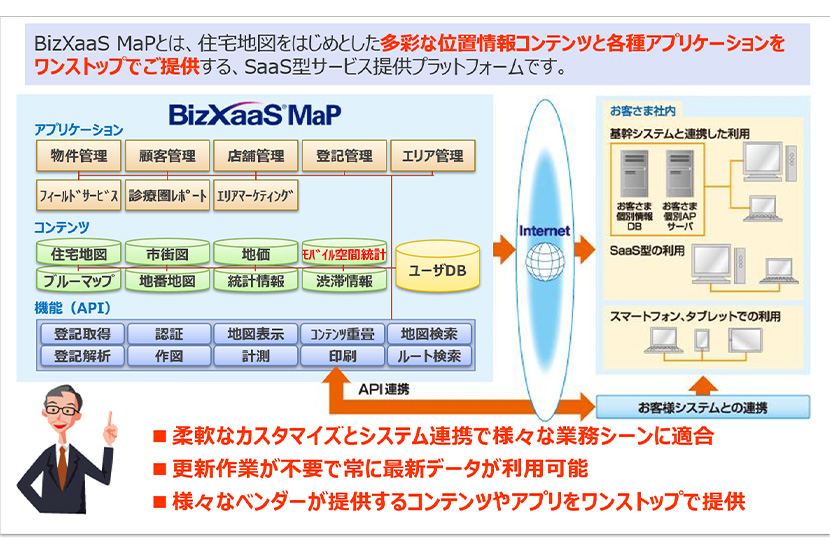 既存システムへのAPI連携など、ニーズに合わせて柔軟な導入が可能です。地図上に指定した範囲内の人口データを集計する機能などを用意しており、API連携によって地図ベースの分析機能を実現することができます。