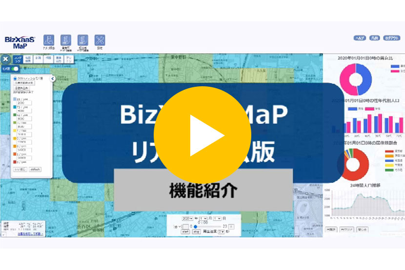 動画で実際の操作画面をご紹介します。地図上で選択した任意のエリアや500mメッシュ単位の時間別人口を視覚的に把握でき、直近1時間前のデータから、1か月前や1年前といった過去に遡ったデータ、またはそれらデータの推移も見ることができます。