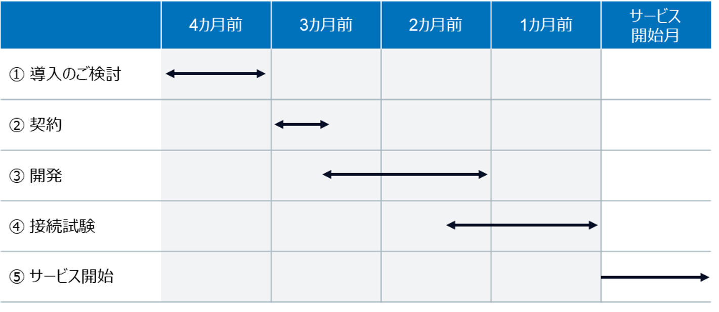 お問い合わせ後、最短4ヶ月でサービス開始が可能です。(実際に必要な期間は企業さまによって異なります。)