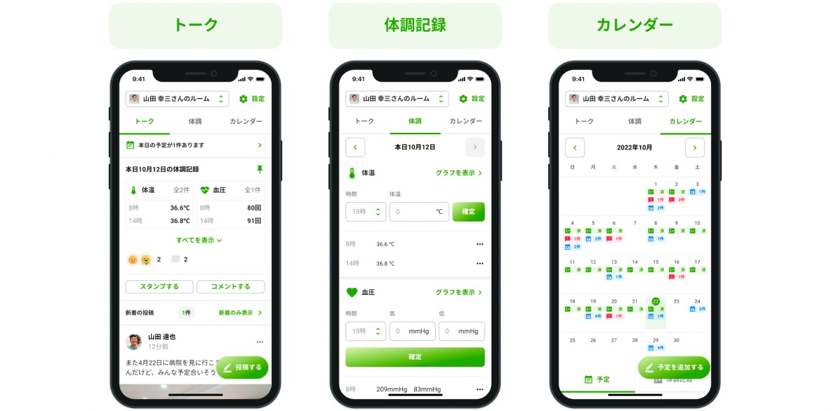 体温、血圧などの基本的な体調記録のほか、食事や服薬、排便などの生活記録、嬉しかったことや気になること、心の天気など気持ちの記録も可能です。また、ケアに関わる予定や家族間の予定をカレンダーで共有しながら、日々の記録を思い出として振り返ることもできます。