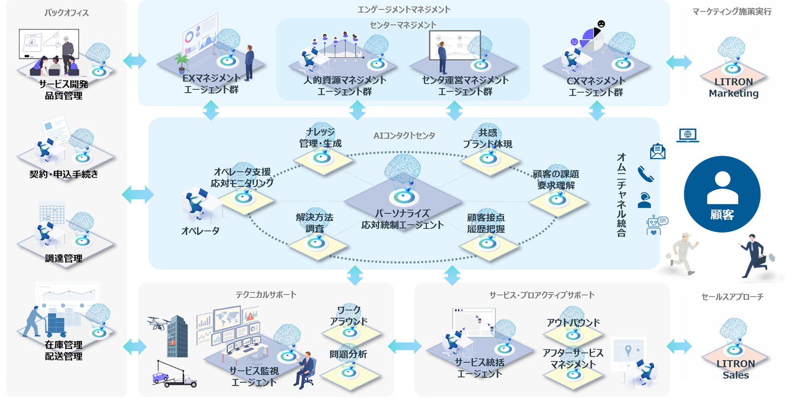 LITRON Customer Engagementは、AIエージェントをオペレーションの中核としながら限られた人的資源をより戦略的な領域に集中し、顧客接点の質・量の向上と企業全体への顧客エンゲージメント向上アクションの展開を実現します。