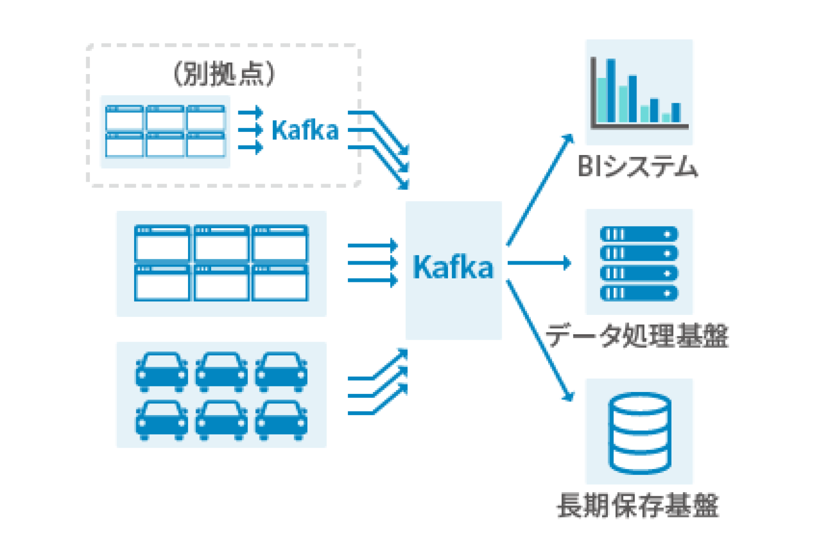 Kafkaは、ストリームデータ(継続的に生成されるデータ)を中継・保存し、必要なタイミングで処理サーバへ渡す役割を担います。
