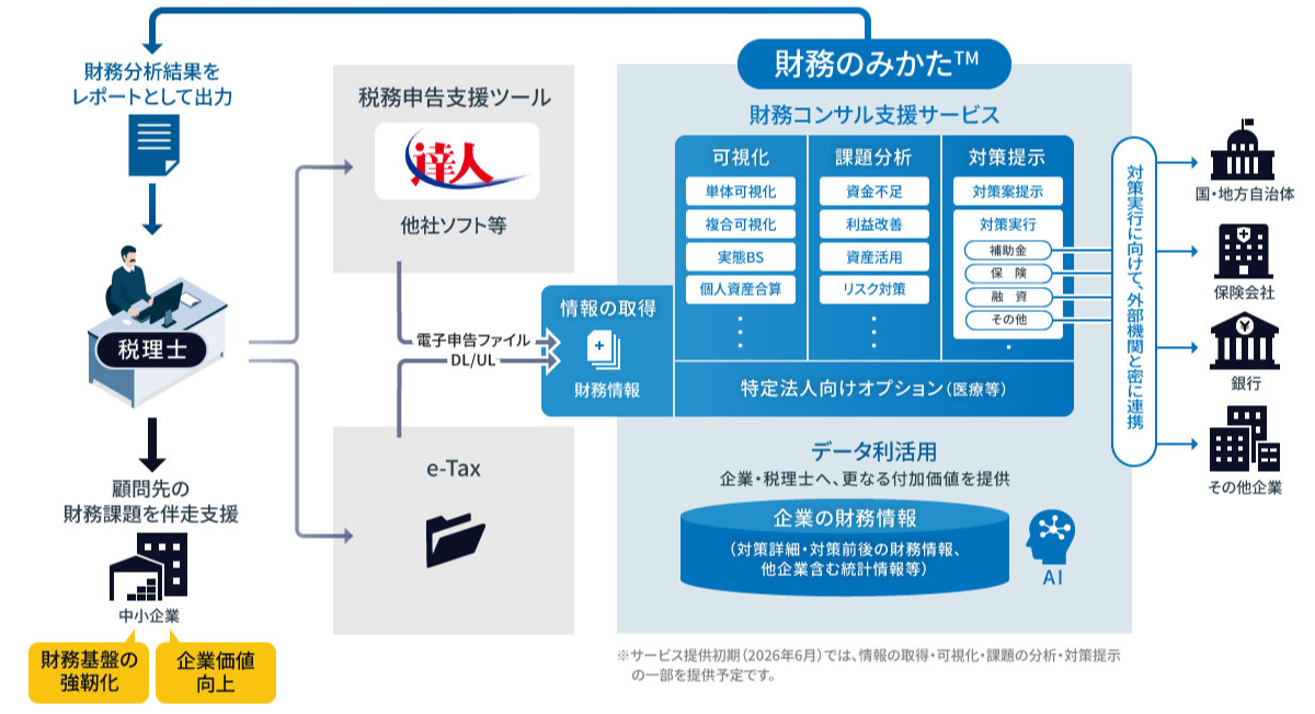 サービスに蓄積される財務データや改善事例をAIで分析することで、財務診断および対策提示の高度化を図ります。税理士がより専門性の高い内容で顧問先と対話し、経営判断を支えることを通じて、中小企業の持続的な企業価値向上を後押しします。