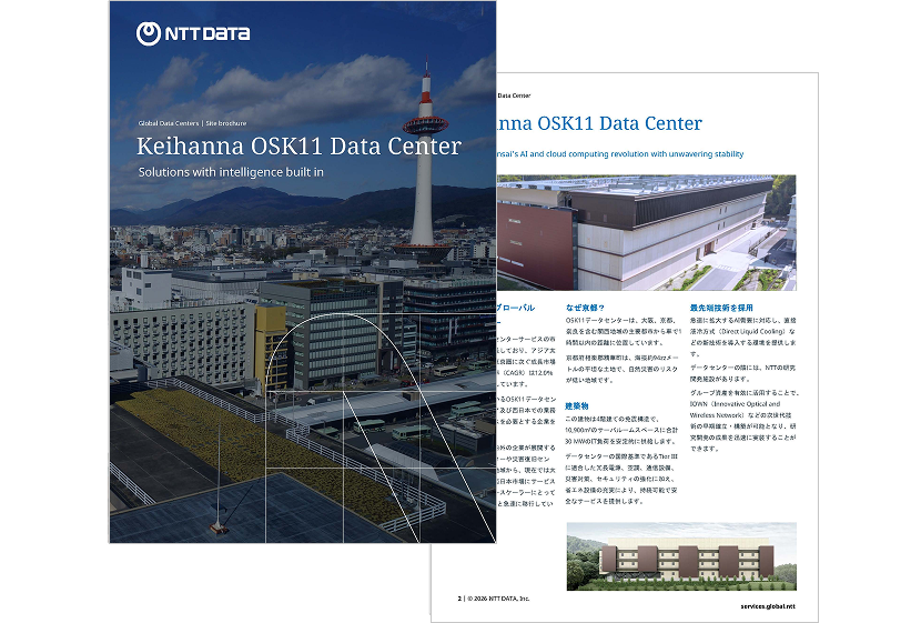 2026年2月にオープンした、京阪奈OSK11データセンターは、4階建ての免震構造で、10,900m2のサーバルームスペースに合計30MWのIT負荷を安定的に供給します。データセンターの国際基準であるTier IIIに適合した冗長電源、空調、通信設備、災害対策、セキュリティの強化に加え、省エネ設備の充実により、持続可能で安全なサービスを提供します。また、NTTグループの研究開発施設に隣接して建設することにより、IOWNの研究をさらに推進します。