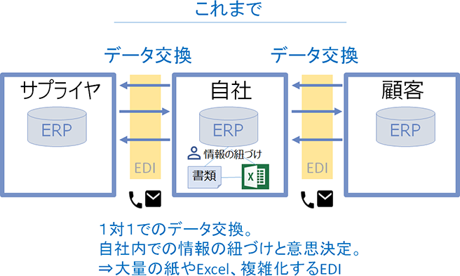 これまで多くの企業では、企業内に閉じた情報を企業ERPで処理し、社外のプレイヤーとの連携はメール/電話/業界EDIなどにより「1対1のデータ交換」で連携するのが一般的でした。それにより、多くの企業では大量の紙やExcel、複雑化するEDIに悩まされることになります。