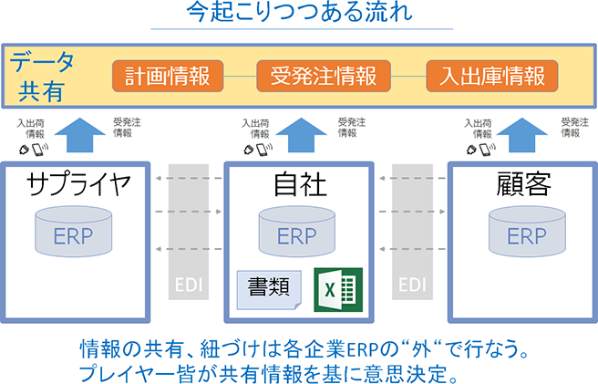 これに対し、今起こりつつある流れは、「データ交換ではなくデータ共有」、つまり「ERPの外でデータを共有し、プレイヤー皆がそれを基に意思決定」することで、サプライチェーンの究極の課題を解消していこうという流れです。
