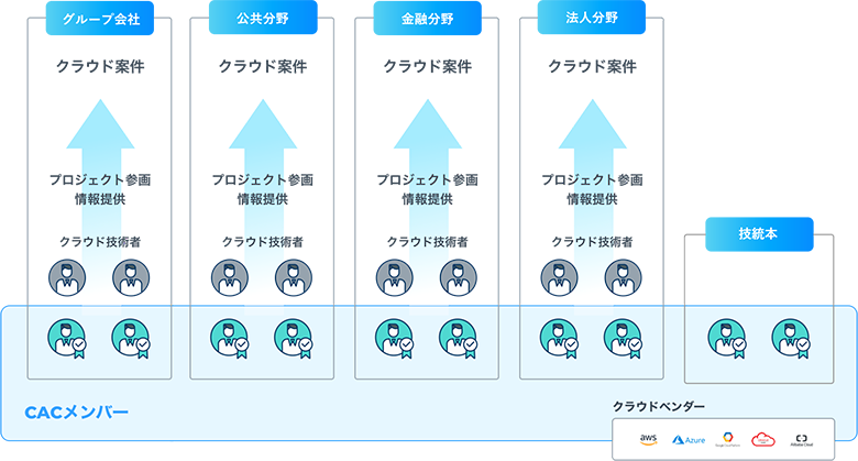 公共・金融・法人の各事業本部と技術革新統括本部から、前線で特に活躍しているクラウド技術の有識者が集められ、広く横のつながりを築くことから活動を開始しました。後に国内グループ会社のクラウド有識者も合流しています。