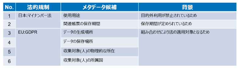 データについて、どんなセキュリティ的な配慮が必要か(公開範囲、保存方法、アクセス履歴管理の要否等)を判断し、メタデータとして管理することもデータスチュワードの重要な役割です。特に法的な規制にも抵触しないか確認する必要があります。以下に事例を示します。