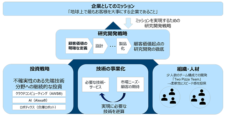 例えば、Amazon Web Services(AWS®)や音声アシスタントのAlexa®、倉庫ロボットといった先端技術は、いずれも顧客体験の高度化を目指した研究開発から生まれたものであり、顧客価値起点の技術開発の成果です。