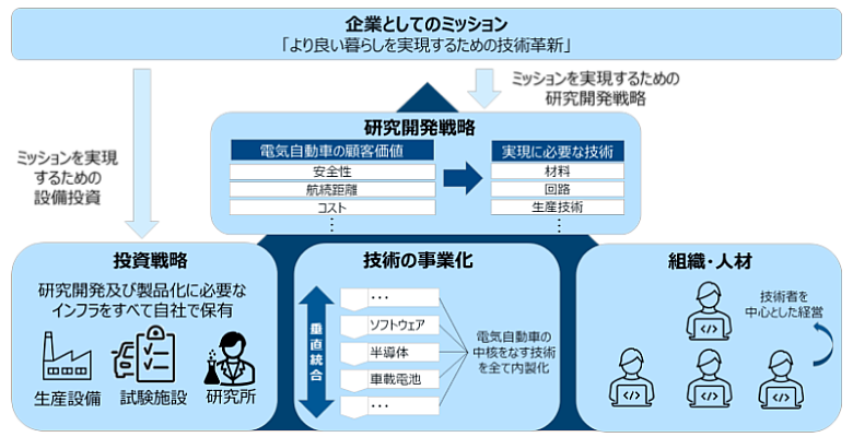 技術の事業化に関しては、ソフトウェア、半導体、電池セルといった中核的な技術資源の自社開発・内製化を進め、サプライチェーンの上流から下流までを垂直統合する体制を構築しています。この垂直統合型の戦略により、研究成果を迅速に製品化し、市場に投入することが可能で、時間的な競争優位を獲得しています(※3)。さらに製品開発の初期段階から複数のプロセスを同時進行で進めるコンカレントエンジニアリング手法により、開発から量産までのスピードを飛躍的に高めています(※4)。