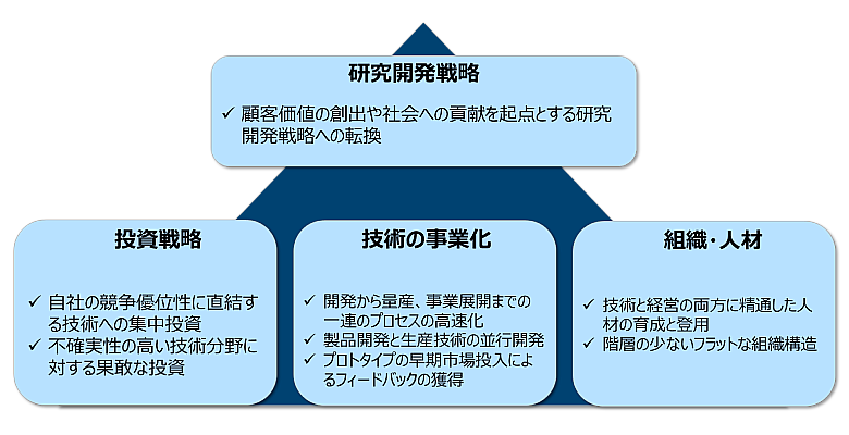 3つ目は技術の事業化です。優れた技術が開発されても、それをプロトタイプに組み込んで実証し、量産開発を経て製品やサービスという形で市場に届かなければ、企業の価値創出に貢献しているとはいえません。技術を事業価値へと変換するためには、製造や品質保証、営業などの他部門と密接に連携し、適切な形で研究開発成果である技術を製品や事業に活用し、最も効果的な時期に市場投入するプロセスが不可欠です。