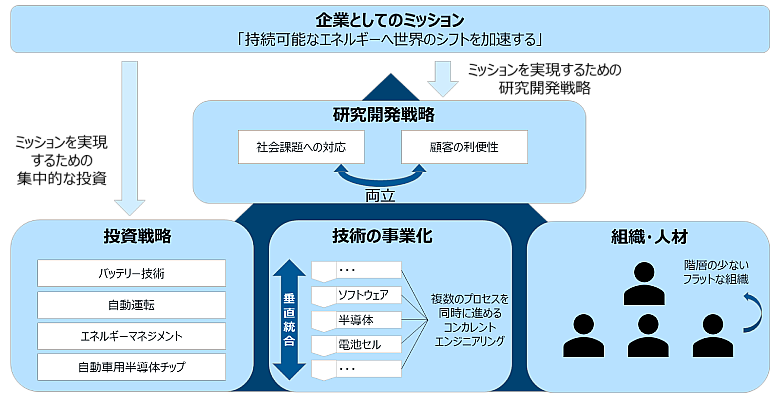 技術の事業化に関しては、ソフトウェア、半導体、電池セルといった中核的な技術資源の自社開発・内製化を進め、サプライチェーンの上流から下流までを垂直統合する体制を構築しています。この垂直統合型の戦略により、研究成果を迅速に製品化し、市場に投入することが可能で、時間的な競争優位を獲得しています(※3)。さらに製品開発の初期段階から複数のプロセスを同時進行で進めるコンカレントエンジニアリング手法により、開発から量産までのスピードを飛躍的に高めています(※4)。