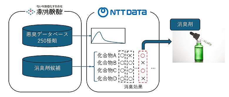 そこでNTT DATAは、香味醗酵の匂いの数値化技術に、当社ラボで培った最適化技術を組み合わせることで、人では発見が困難な匂いの合成パターンを探索する手法や、消臭剤製造期間を従来比95%削減する新たな消臭成分調合手順の開発など、素材開発プロセスの大幅な効率化に成功しています。