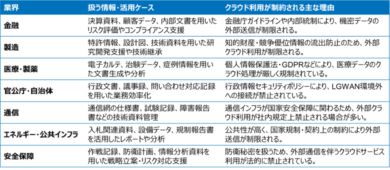 生成AIはいま、業務効率化や意思決定支援など、さまざまな領域で注目を集めています。しかし実際には、以下の表のようなセキュリティや法令順守を重視する業界では、期待ほど導入が進んでいません。その背景にあるのは、それらの企業が抱える“利便性と安全性のジレンマ”です。