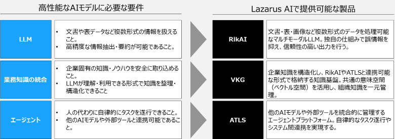 図3:高性能なAIモデルに必要な要件とLazarus AIの提供機能